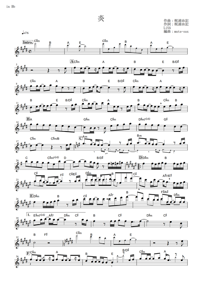 Lisa 炎 鬼滅の刃 無限列車編 In Bb By Muta Sax Sheet